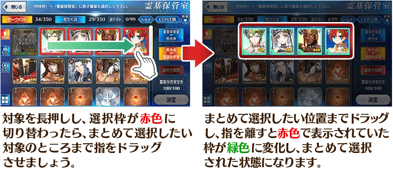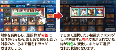 - You can now drag to select servants and craft essences. (To drag, touch a card and hold till the box of the card is highlighted red.)