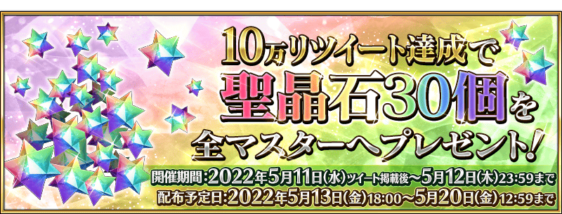3 are also given to players who login during May 11, 2022 20:00 ~ May 18, 2022 12:59 JST - Requirement: Clear Fuyuki before May 18, 2022 12:59 JST