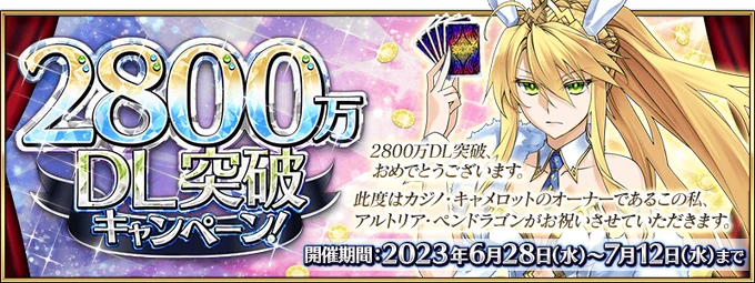 | June 28, 2023 18:00 ~ July 12, 2023 17:59 JST | Artoria Pendragon (Ruler) as NPC Support Servant for Ember Gathering and Into the Treasure Vault (Servant EXP & QP) for a Limited-Time |