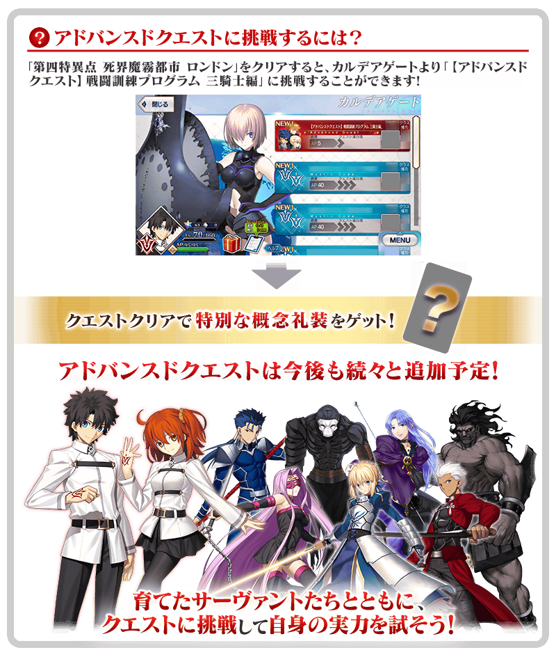 - Advanced Quests are quests to test your skills using only your Servants. (Special Party)