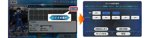 - An option at the top right that allows players to adjust which Rarity/Class of EXP to auto-fill into the 20 synthesis material slots.