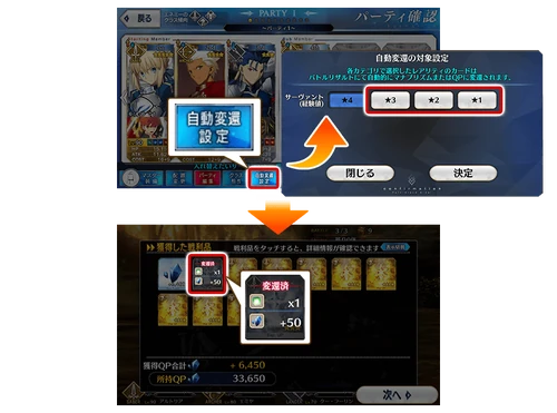 - A new option in party setup before a quest that allows players to select which rarity of EXP cards to burn/discard automatically upon finishing a quest.