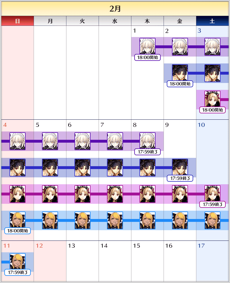 | 1/2 QP Cost when Leveling Up Servants (For All Servants) | February 1, 2024 18:00 ~ February 14, 2024 12:59 JST |