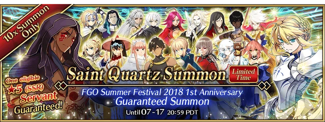 Grand Summon once for one of two parts of the Summoning Campaign. At least one 5★ Servant from the listed ones will be summoned for each part.