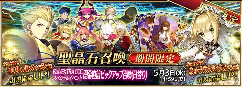 | April 30 00:00 ~ 23:59 JST | Nero Claudius (Bride), Gilgamesh |