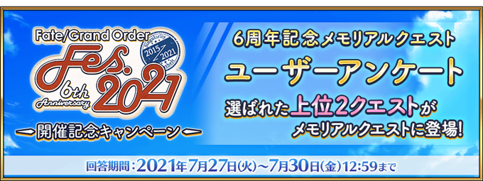 The 6th Anniversary Memorial Quests questionnaire created by the Fate/Grand Order Management Team. The top 2 most chosen quests will become 6th Anniversary's Memorial Quests.