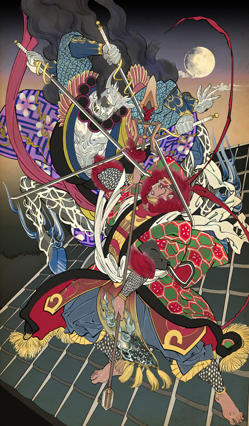 | 凡夫は不登の頂にて、 剛刃は艶やかに舞い、玉鉾は雄々しく奔る。 |