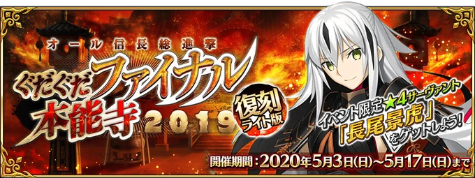 Event Title: Rerun:Destroy All Nobunagas: GUDAGUDA Final Honnōji 2019 Lite Ver. (復刻:オール信長総進撃 ぐだぐだファイナル本能寺2019 ライト版, Fukkoku:Ōru Nobunaga Sōshingeki GUDAGUDA FAINARU Hon'nōji 2019 Raito-ban??)