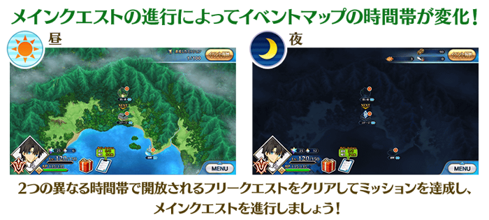 Time of Day progresses with the Main Quests, and new Quests that are locked to a certain Day/Night time will be unlocked based on the schedule below.