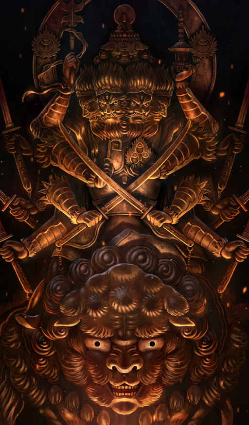 The grotesque statue of Bishamonten wielding eight treasured swords and mounted on a lion inherited by Kagetora from her beliefs.